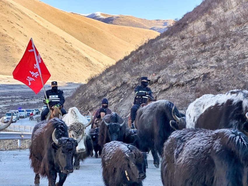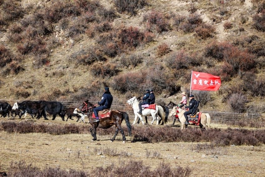 石渠民警在海拔4000米草原护航牦牛迁徙。甘孜州公安局供图