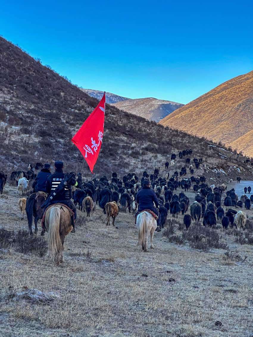 “今天,我们就要跟随长须干玛乡200多户1000多头牦牛,开启从莫日多秋季牧场转场到冬季牧场,将耗时4小时完成转场!”牦牛被牧民和现场护航的民辅警浩浩荡荡地赶往冬季牧场。为了确保迁徙初期草场纠纷零发生,将矛盾化解在萌芽阶段,这次转场石渠警方也参与其中,帮助牧民迁徙。