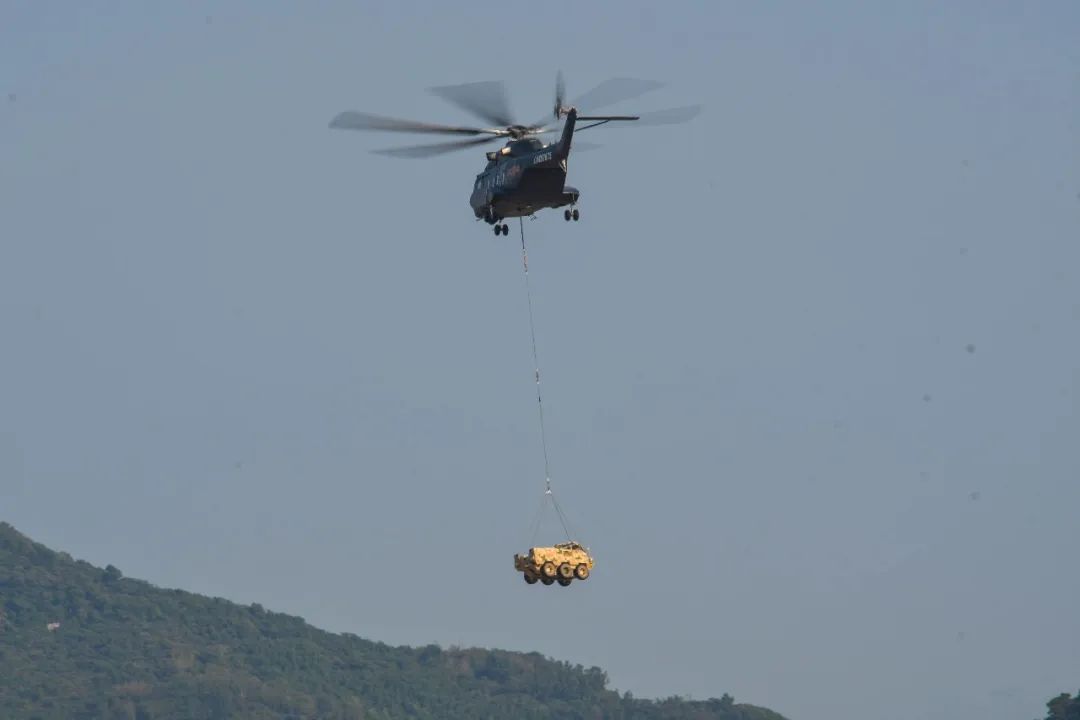 直8L自上次在建党100周年庆祝大会上悬挂巨型横幅通场后,再度亮相第十四届中国航展。在航展飞行表演中,直8L悬挂一辆山猫突击车腾空而起,在环场飞行一圈后安稳着陆,为观众们上演了一出“力拔山兮气盖世”的拿手好戏。