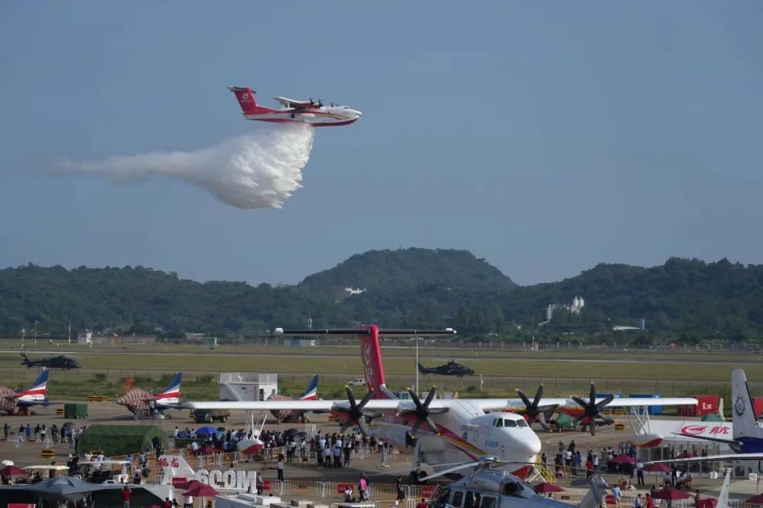 两架“鲲龙”AG600M(灭火型)以“动静结合”的方式参加航展,并以全新涂装惊艳亮相,进行12吨投水演示,全面展示了灭火任务系统功能,进一步评估了其投水灭火效果。