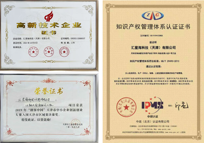 技术创新不断加速。截止目前,汇星海拥有17项实用新型*及4项发明*,并获得知识产权管理体系认证证书、良好高新技术企业认定,获2019年“创客中国”中小企业创新大赛500强,科研实力屡获肯定。汇星海以技术为依托,以通过工业级无人机作业助推工业智能升级变革为己任,不断开拓创新,研发出多款广泛受用户认可的无人机产品,让一些复杂的作业任务可以通过省时省力的方式得以完成。