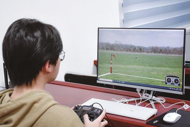 学员正在无人机产业园内模拟学习无人机操控。 记者 王欢 摄