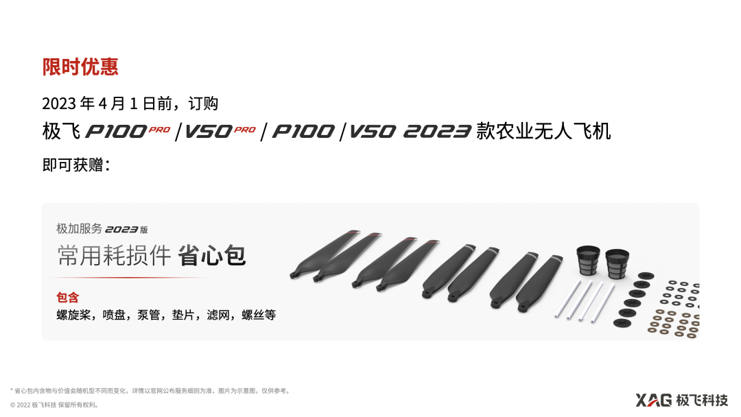 2023 年 4 月 1 日前,凡从极飞科技或其他授权合作方等正规渠道购买极飞 P100 2023 款、V50 2023 款 、P100 Pro 2023 款 、 V50 Pro 2023 款农业无人飞机,均能获取由极飞提供的常用耗损件“省心包”配件套装。