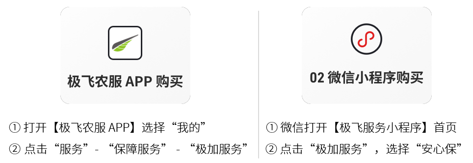 用户可前往“极飞农服 APP”-我的-服务-保障服务-极加服务,或“极飞服务小程序”-极加服务-安心保购买。