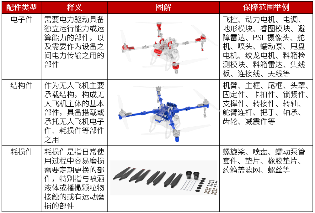 「极加服务 2023 版」“安心保”基于农业无人飞机的三类配件设置保障内容,大概分类如下:
