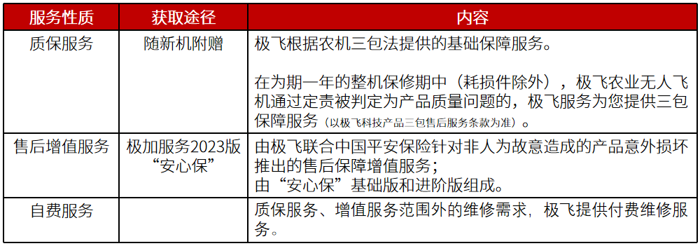今天给大家介绍的是以上类型的增值服务部分。极飞为了让广大用户更安心使用产品推出了「极加服务 2023 版」,全部内容如下: