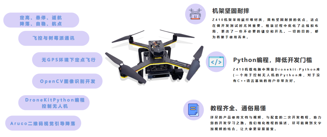 Z410是阿木实验室与苍穹四轴DIY结合科研入门学习的需要,专为无人机开发者打造的二次开发平台,适用于无人机及机器人专业的入门级科研开发和应用研究(Z410的Z代表Zero,即为初学者打造的一款从零开始学习的无人机/机器人开发学习产品)。我们希望通过它来引导大家从入门到了解并熟悉现在优秀的开源项目ArduPilot/DroneKit/ROS,以及优秀的开源硬件Pixhawk。在此基础上结合自己的研究项目,开发丰富的无人机应用。