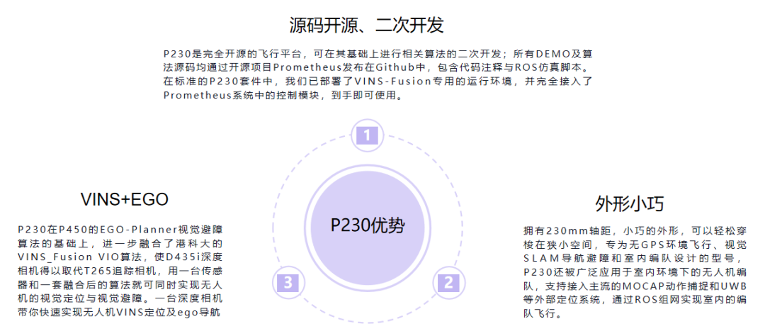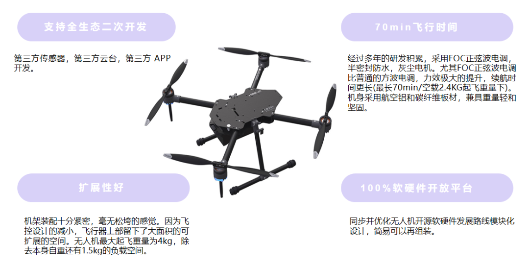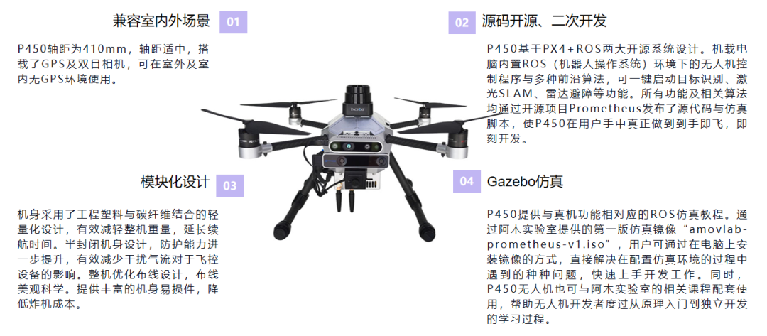 P450遵循“ 让研发更高效 ”的设计理念,基于开源飞控PX4及机器人操作系统ROS打造,内置了开源自主无人机软件平台Prometheus,提供丰富的算法demo例程,涵盖控制、规划、SLAM、目标检测、深度学习、集群控制等多个无人机及人工智能相关研究方向,旨在为无人机的智能与自主飞行提供全套解决方案。