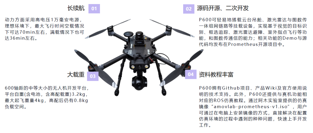 P600是阿木实验室推出的一款准行业级无人机研发平台,适用于无人机行业应用开发与室外环境下的无人机算法验证。是一款中等大小的无人机开发平台,具有大载重、长续航、可扩展的特性。可搭载激光雷达、NX板载计算机、三轴光电吊舱(10倍光学变焦)、RTK等智能化设备。实现吊舱框选跟踪,激光雷达避障,无人机位置速度指点飞行。本开发平台基于Prometheus开源项目,提供丰富的demo例程,涵盖控制模块、slam模块、规划模块以及目标检测模块等多个无人机及机器视觉相关研究方向,为无人机科研开发助力,致力于让研发更加高效。