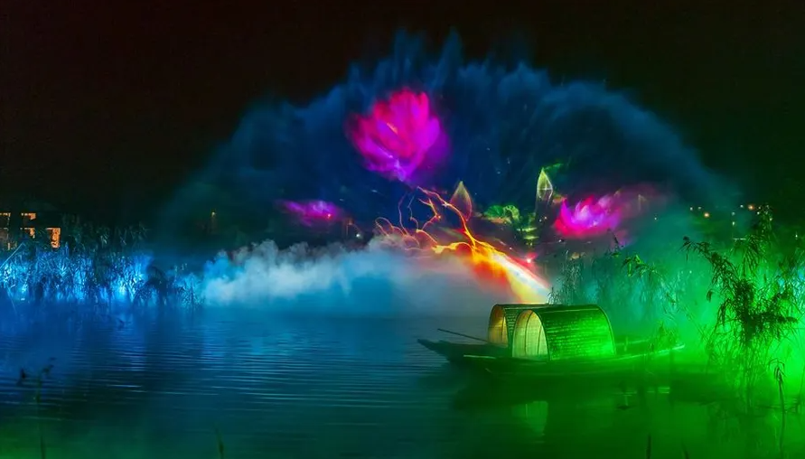 水幕灯光秀是以透明的水膜作为载体播放灯光影像,在播放影像内容时会有一种特殊的光学效果,在画面呈现上更具立体感。声光交汇间,构成了一幅非常美丽的画面,给观众带来了极大的视觉冲击,让人流连忘返。
