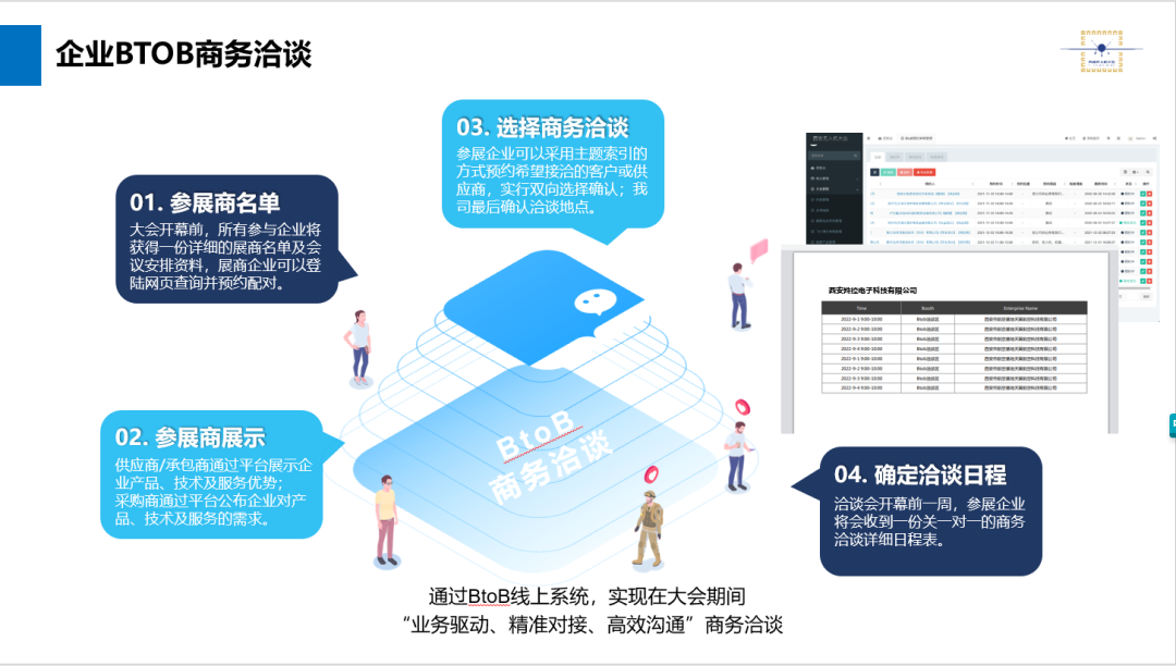 B To B商务洽谈以“业务驱动、精准对接、高效沟通”为特色,通过大会自建的企业一对一商务洽谈系统,会期牵线无人机整机、设备、配件等无人机生产制造企业,培训、租赁、系统服务、测试场地等无人机服务企业,延长石油、延长中煤榆林能源化、京东天鸿、陕汽等行业用户单位,帮助无人机生产与服务企业、无人机行业用户与研发生产单位成功“配对”。大会期间累计完成123场线上对接撮合,达成100项合作意向,高质量促进企业间务实合作。