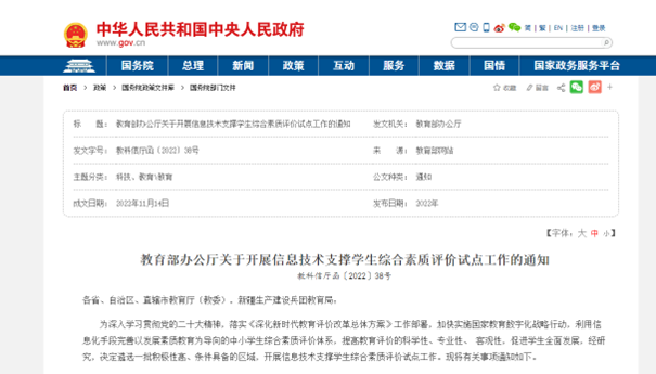 近日,教育部办公厅印发关于开展信息技术支撑学生综合素质评价试点工作的通知,决定遴选一批积极性高、条件具备的区域,开展信息技术支撑学生综合素质评价试点工作。计划用5年左右的时间,形成百万级规模中小学生综合素质发展基础数据库,创新评价工具,利用人工智能、大数据等现代信息技术,探索开展学生各年级学习成长情况全过程纵向评价、德智体美劳全要素横向评价。