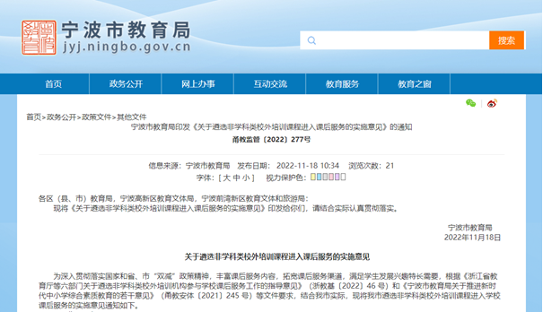 3.宁波市《关于遴选非学科类校外培训课程进入课后服务的实施意见》