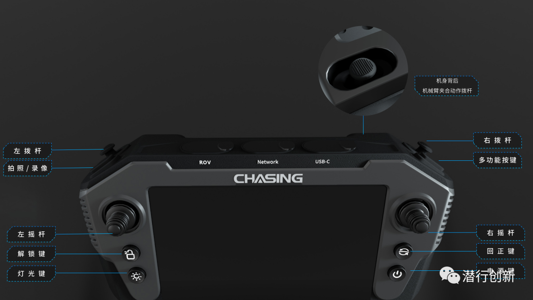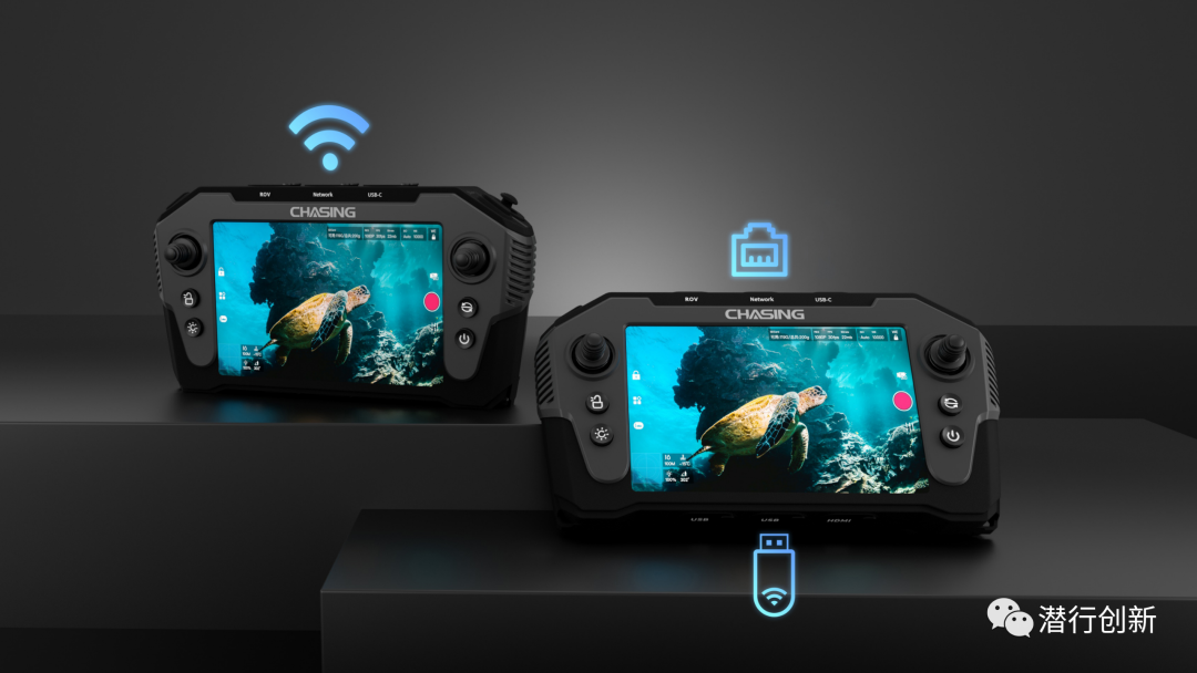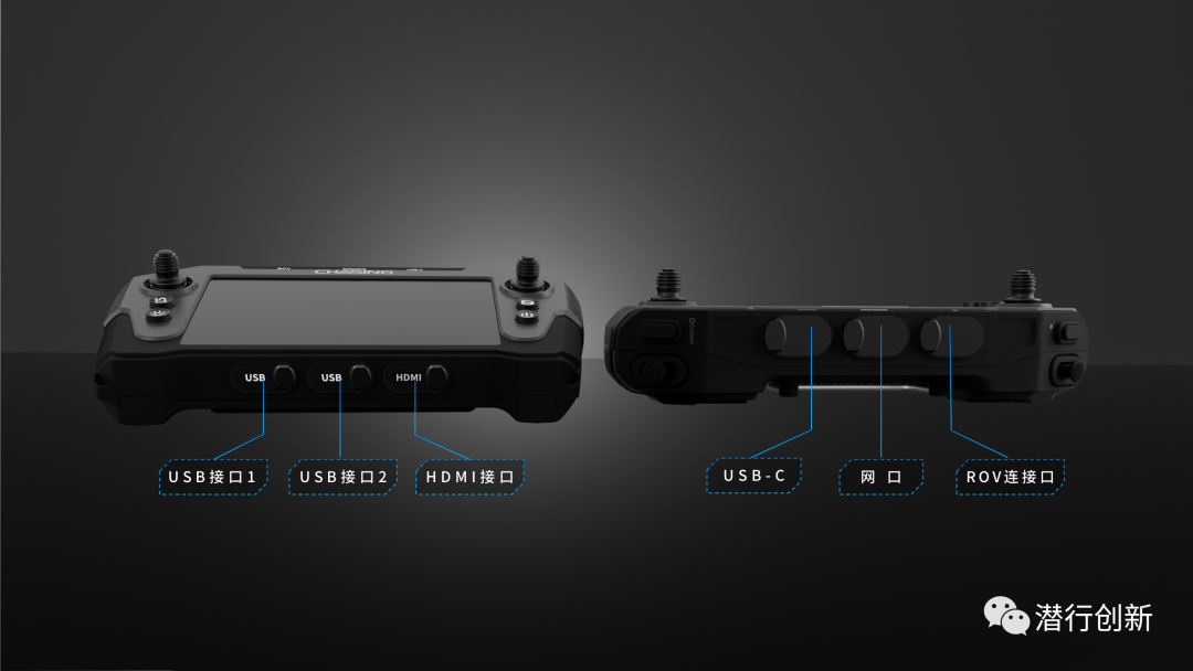 潜行防水带屏遥控器除ROV连接口外,还配备1个网口:用于网线连接,也可通过网口连接两台遥控器,进入“观察者模式”;配备1个USB-C接口:用于遥控器充电;配备2个USB接口:可插U盘、连接手机等进行数据传导;配备1个HDMI接口:可供连接外设显示屏。