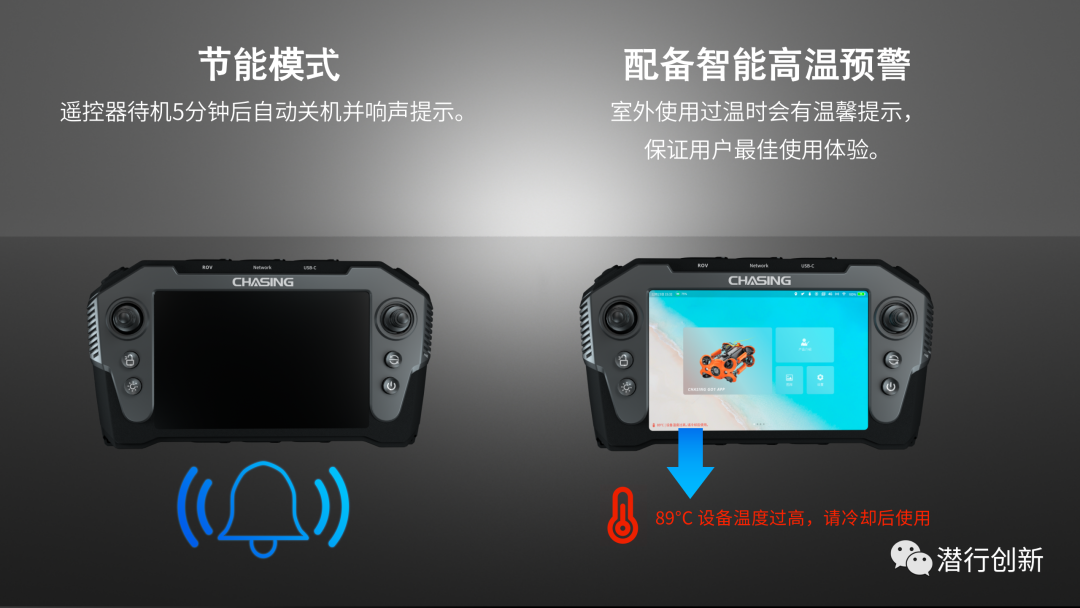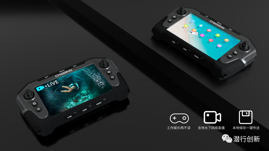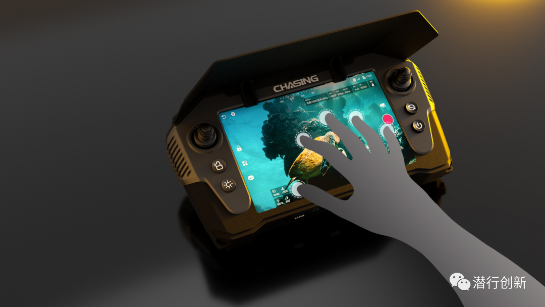 同时,不仅满足工作需求,遥控器可当做平板使用,可听歌,看电影等,工作娱乐两不误;可通过CHASING GO1 APP对水下拍摄内容进行网络直播;可通过遥控器将本地保存的拍摄内容第一时间通过邮件、社交软件、工作软件等进行传送。