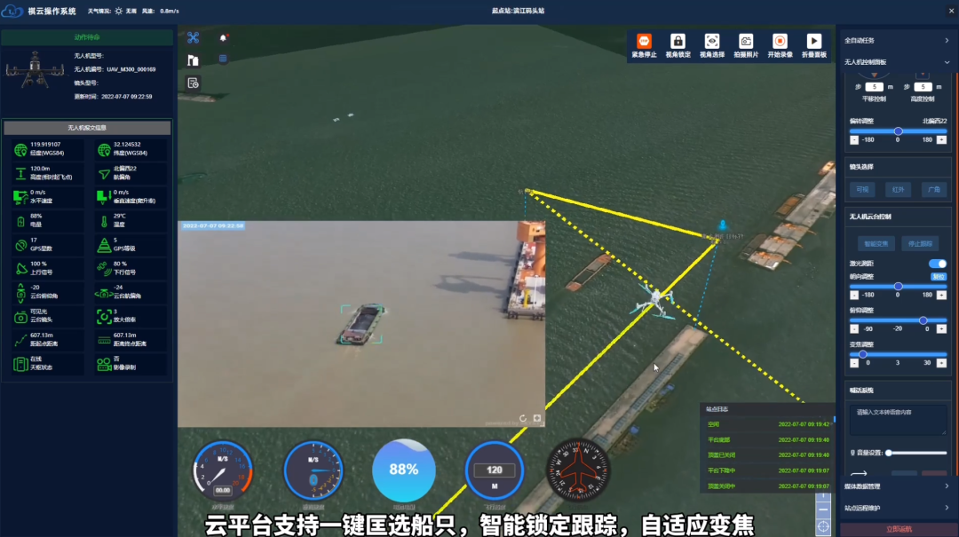 针对不同巡检目标,管理人员可针对业务场景实现不同的飞行方式和采集方式,通过祺云平台下达任务,调配指挥无人机进行执飞作业,并实时将视频监控数据推送到指挥中心后台,利用无人机挂载的双光云台相机,对港口进行常态化巡检工作。