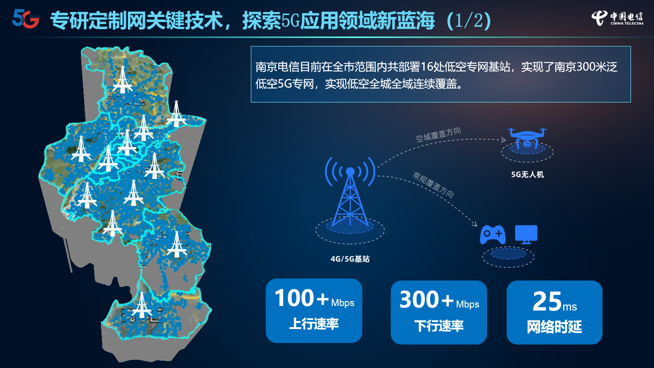 南京电信无线中心副主任吴亚晖告诉记者,南京电信在全市建成8200多个5G基站,在商场、交通枢纽等重点楼宇覆盖4500多套室分系统,全市5G覆盖率达到97.8%,平均下行速率达583Mbps。由于5G无人机的飞行控制、图像回传,需要一张连续的5G空域专网,南京电信携手南京航空航天大学、长空科技等生态伙伴,在全市部署16处泛低空专网5G基站,与公网实现物理隔离,完成南京全域300米以下泛低空5G专网全覆盖。多轮空域测试表明,泛低空专网可提供超过100Mbps的上行速率和超过300Mbps的下行速率,网络最大时延控制在25毫秒以内。这张专网既创新空域覆盖方式,减少同频干扰,又采用最优策略配置,使专网用户易切入、难切出,而公网用户难以接入。