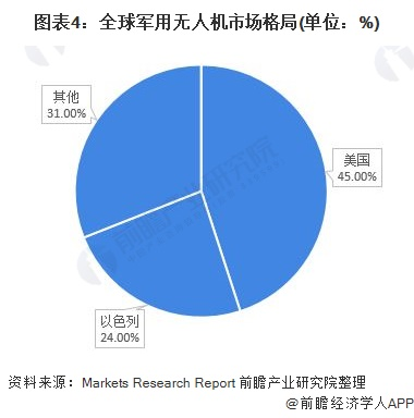 根据Markets Research Report公布的2019年全球军用无人机市场份额来看,当今在军事无人机领域的世界领先者为美国和以色列,分别占45%和24%的份额。
