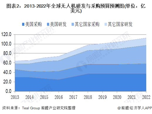 根据Teal Group预测,到2022年,全球无人机研发与采购预算中,美国将达到30亿美元左右,研发将在10亿美元以上。