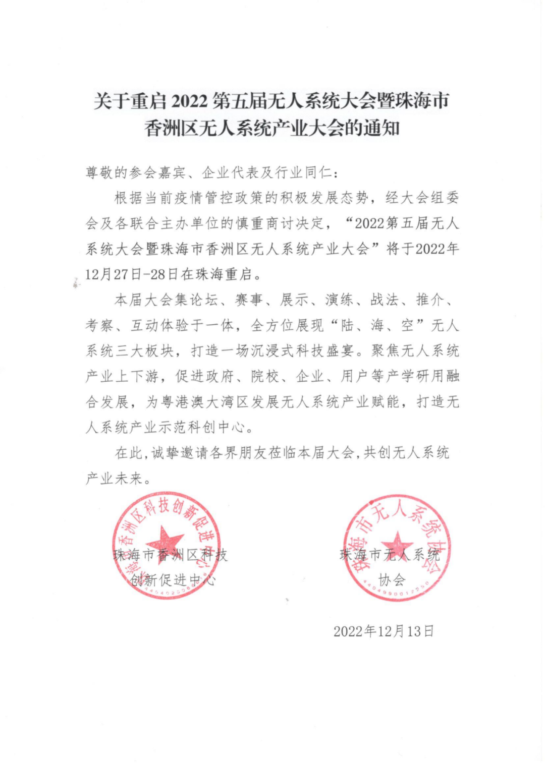 根据当前疫情管控政策的积极发展态势,经大会组委会及各联合主办单位的慎重商讨决定,“2022第五届无人系统大会暨珠海市香洲区无人系统产业大会”将于2022年12月27日-28日在珠海重启。