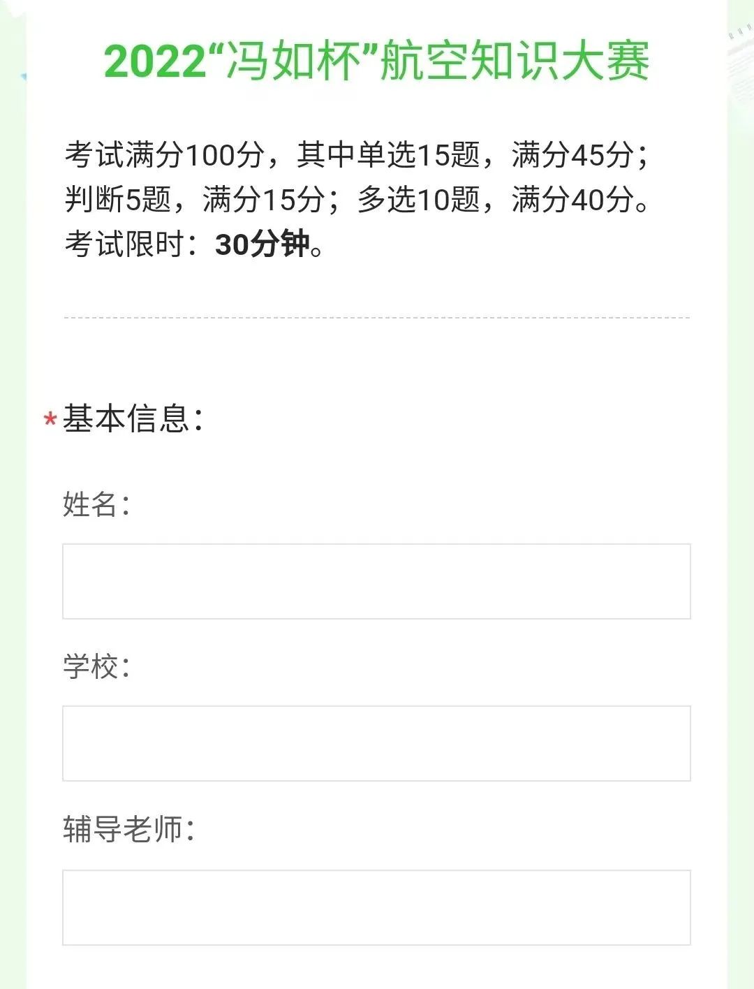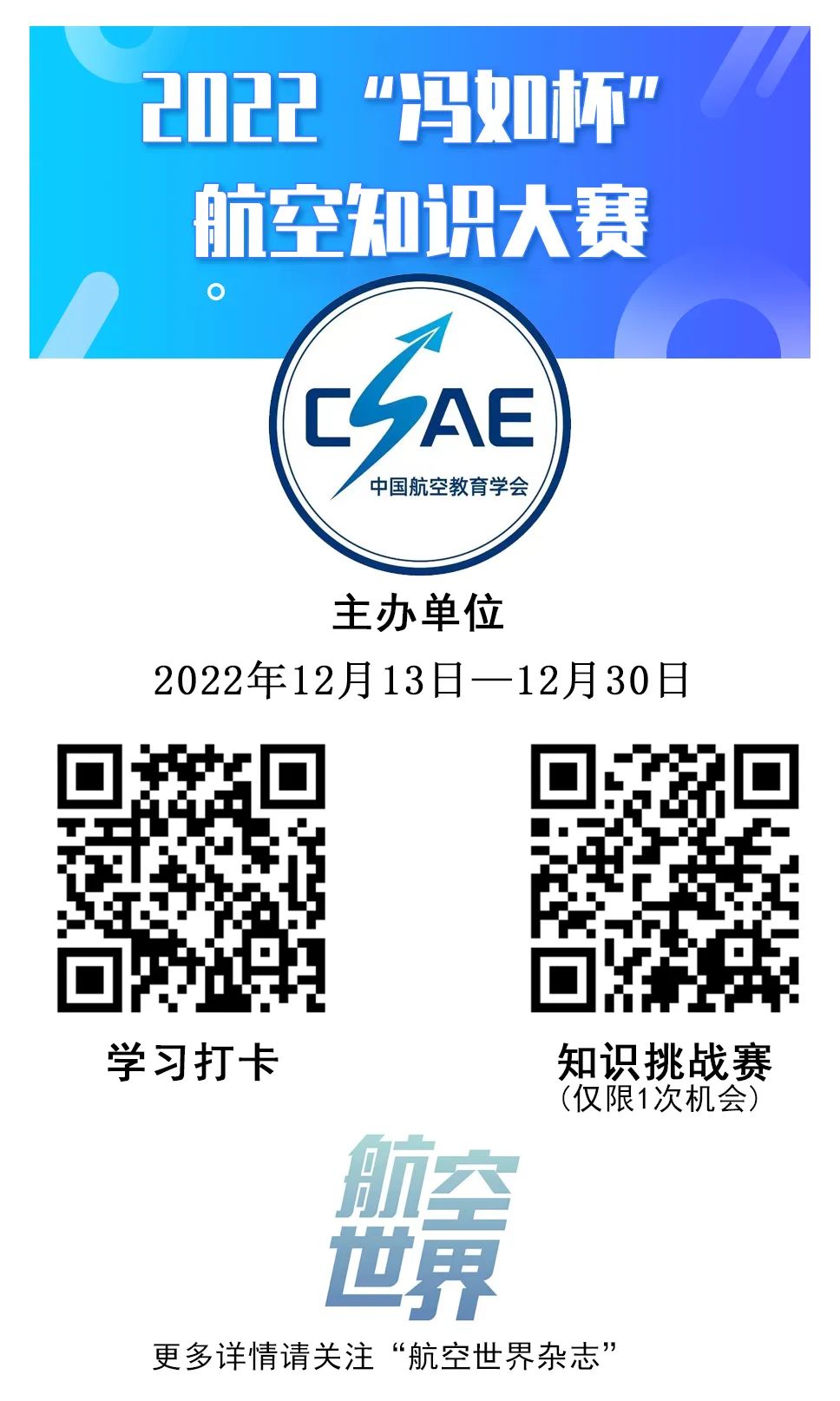 为了在广大中小学学生中宣传航空知识,激发同学们探索未知、敢于创新的热情,为我国航空工业的发展培养后备人才,为实现中华民族伟大复兴的中国梦凝聚强大力量,中国航空教育学会特举办2022“冯如杯”航空知识大赛,现已正式开赛!