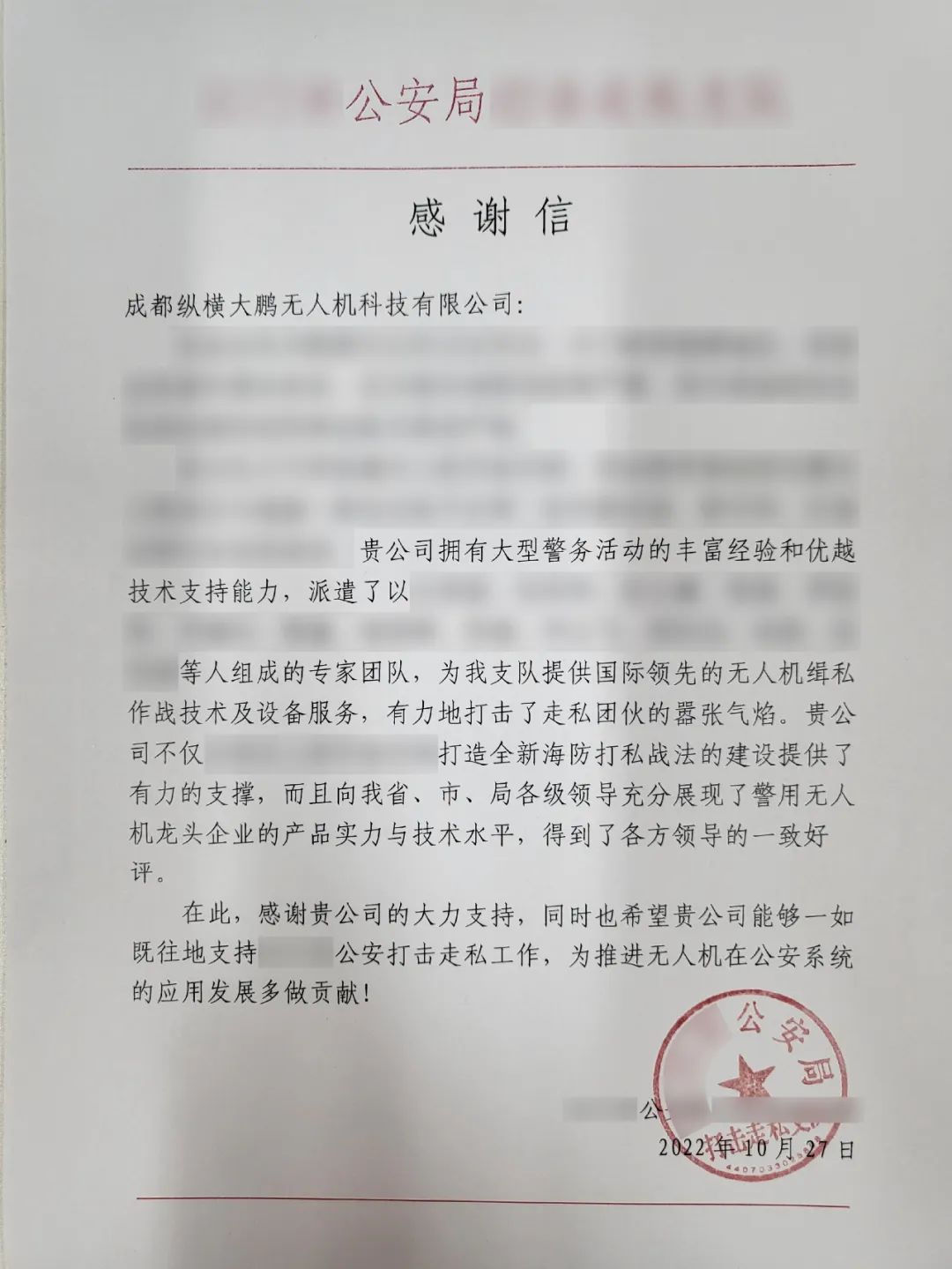 走私船只逃窜时抛洒的走私货品,在海面分布情况一目了然在今年7月-10月某地开展的的”缉私百日行动“期内,纵横大鹏无人机帮助公安部门共查获涉案船只22艘、车辆67辆;缴获走私冻品15.8吨、油料11吨、非法砂料白泥灰泥1.6万吨;抓捕罪犯68人。如此显著的战果得到了该公安局专门发函表彰:
