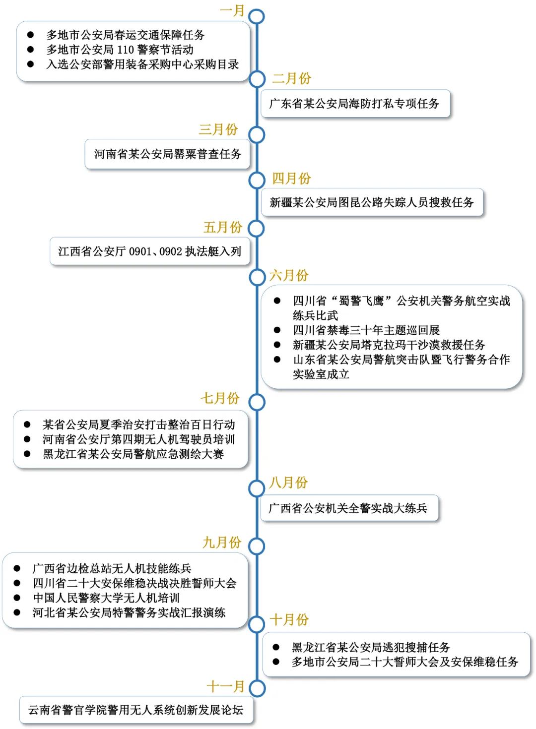 2022年,纵横大鹏无人机在公路交通、边海防、反走私等领域发挥了积极作用,除了上述案例外,还在全国各地参与了多种类型任务,我们梳理了部分案例,如图: