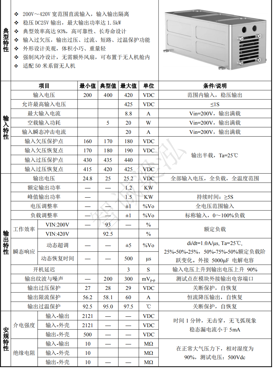 1.2KW系留无人机机载电源,最大功率1.5KW