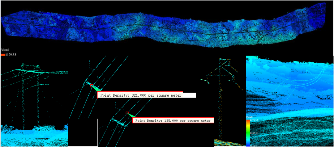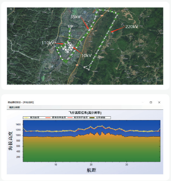 在某项目中,CW-15LiDAR系统扫描涵盖20kV、110kV、35kV以及局部10kV线路,航线按照仿地220m高度自动生成,航线总长70km,扫描线路总长度32km。