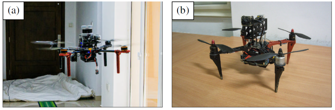 图5 实际实验中使用的无人机平台:(a)携带Ouster 3D LiDAR的主无人机,(b)带有单目摄像头的辅助无人机