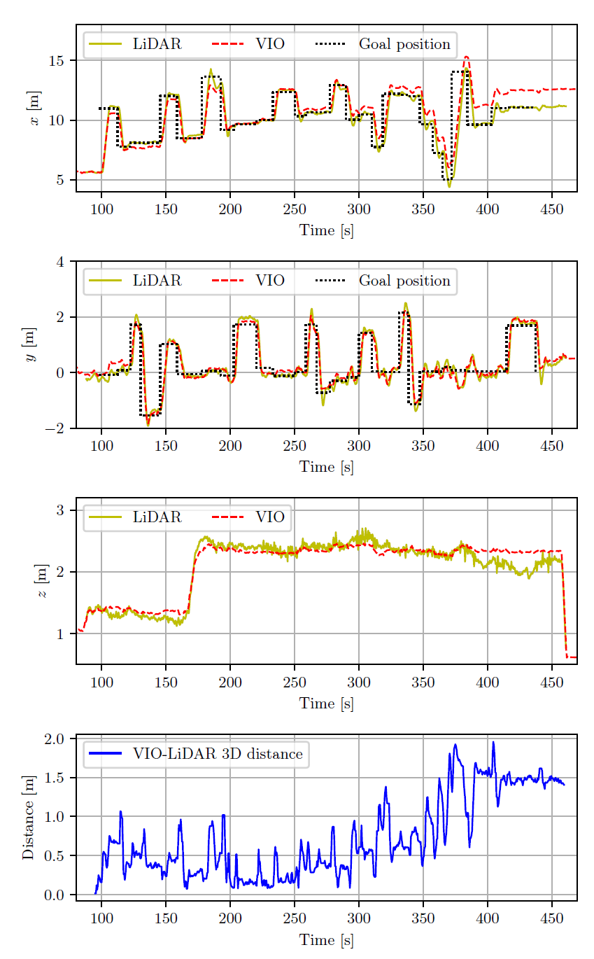 无人机经过的轨迹如图7所示。在飞行过程中,主无人机不断改变其位置、高度和航向。辅助无人机成功引导到目标位置。图 8显示了VIO和LiDAR相对定位输出以及目标位置的比较。该图还显示了实验过程中每个点随时间推移计算的VIO和LiDAR输出之间的3D距离。VIO输出逐渐偏离LiDAR定位输出。