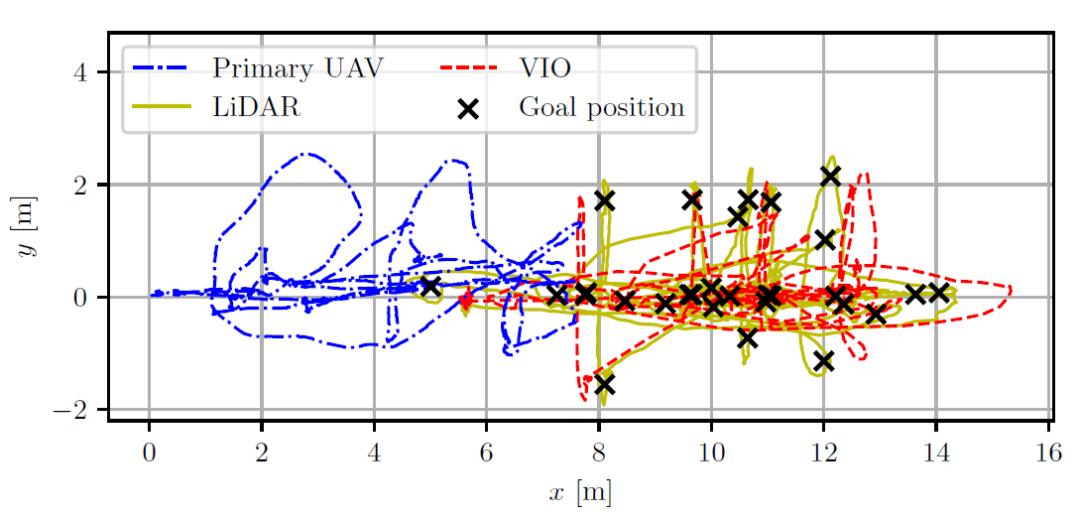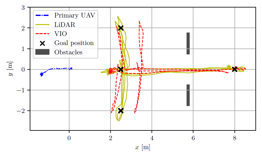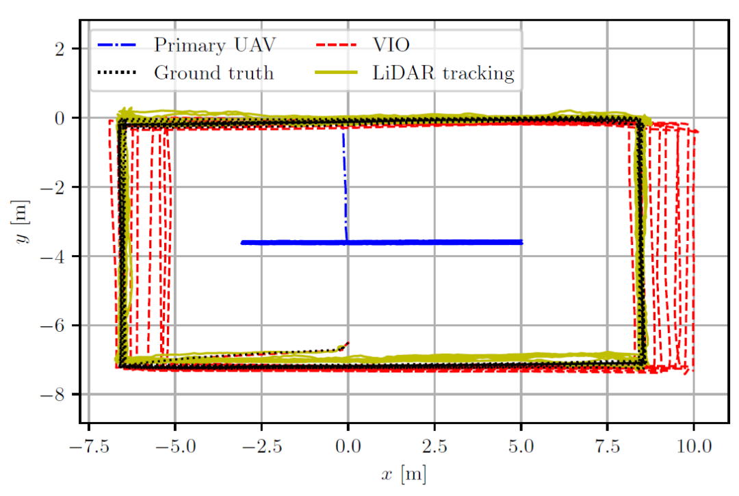 仿真和实际实验都表明,LiDAR相对定位在精度方面优于VIO自定位,因为它不受视觉自定位方法固有的有害因素的影响。相对定位成功地用于精确引导辅助无人机,即使主无人机正在移动并且靠近障碍物。在靠近障碍物的飞行中,VIO输出偏离LiDAR位置超过1m(见图9)。