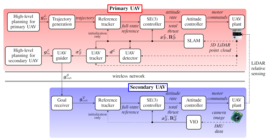 图1 配备3D LiDAR的大型主无人机正在驾驶一架携带单目视觉相机的小型辅助无人机