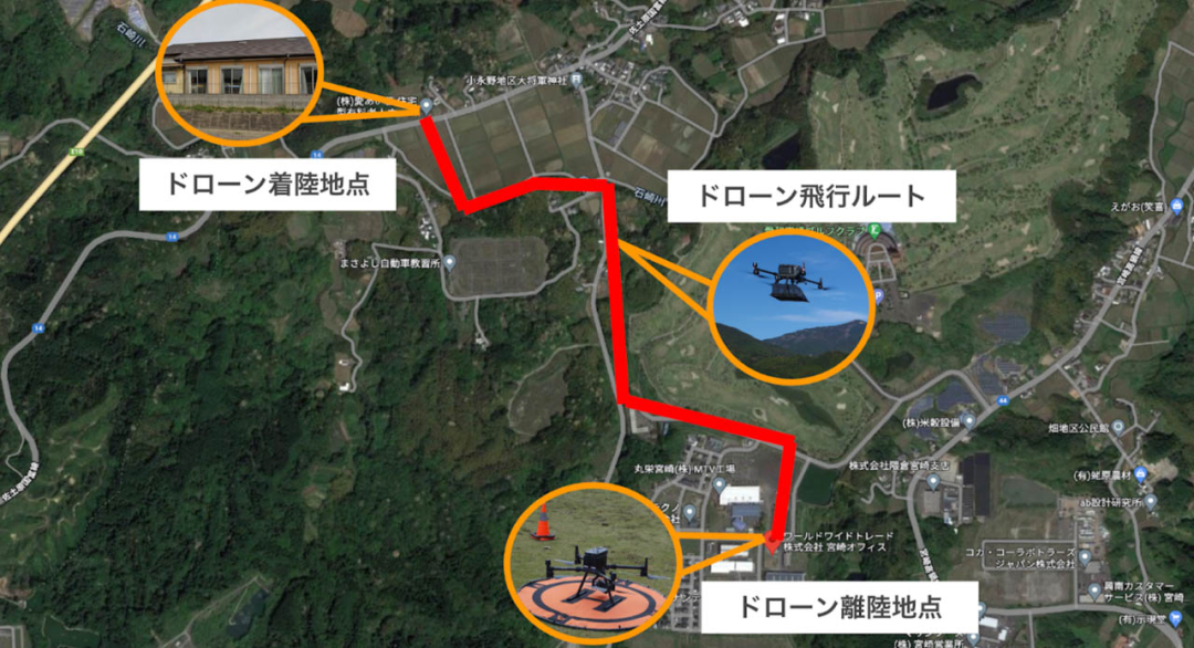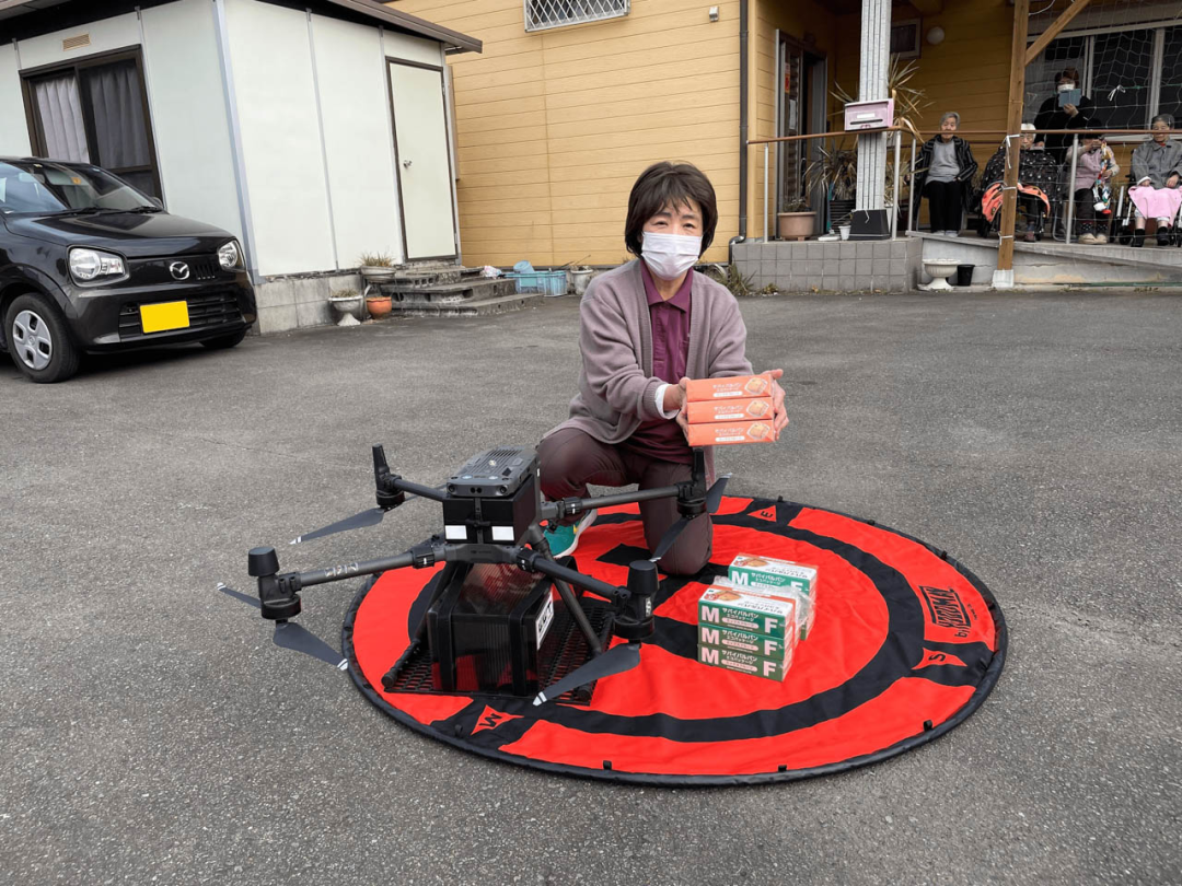 Ai-wa住宅付费护理院被用作物资的运送目的地,一架无人机从科技村的世界贸易仓库飞来,运送防灾餐。飞行路线的规划得到了土地所有者的同意,无人机在2级飞行时有专人看守,以防止第三方进入无人机的飞行范围。
