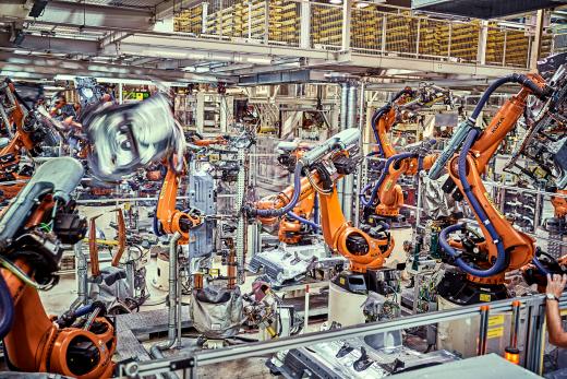 在斯柯达,成群结队工作的机器人主要出现在焊接车间。