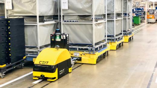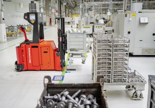 原来的自动物流牵引车已经被更先进的机器所取代,它可以铲起托盘,通过液压将其抬起,然后运到工厂指定的目的地。