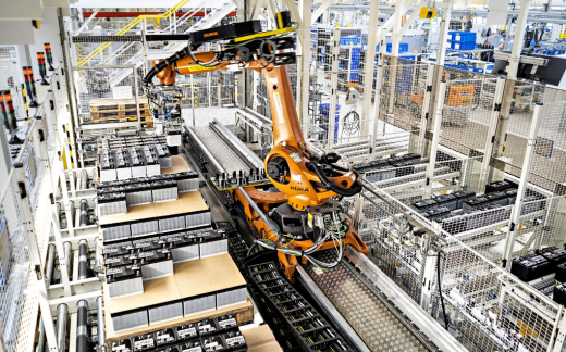斯柯达的 Kvasiny 工厂使用机器人从货盘上收集启动器电池并将它们移动到生产线上。