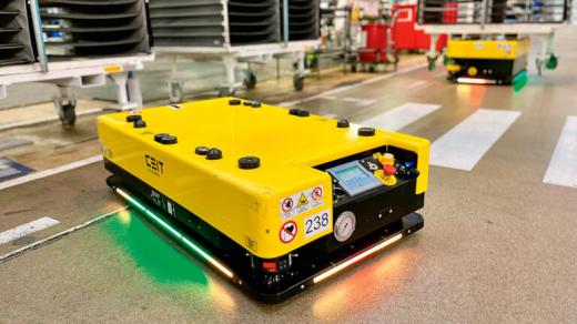 它们不是固定的,它们的工作是在轮子或轨道上自由移动。它们的主要区别在于所用轮子的数量及其布置——目的是让机器人能够克服其环境中的各种障碍。车轮本身的设计也很重要,例如尺寸和覆层。由于机器人四处移动,它们必须有一个导航系统。这些机器人可以执行各种任务——比如在火星上采集样本。但它们在工业中很普遍,例如以 AGV(自动导引车)的形式。