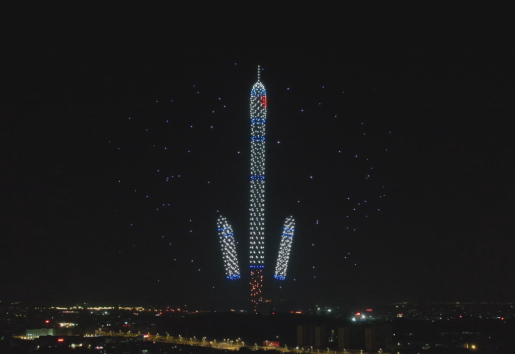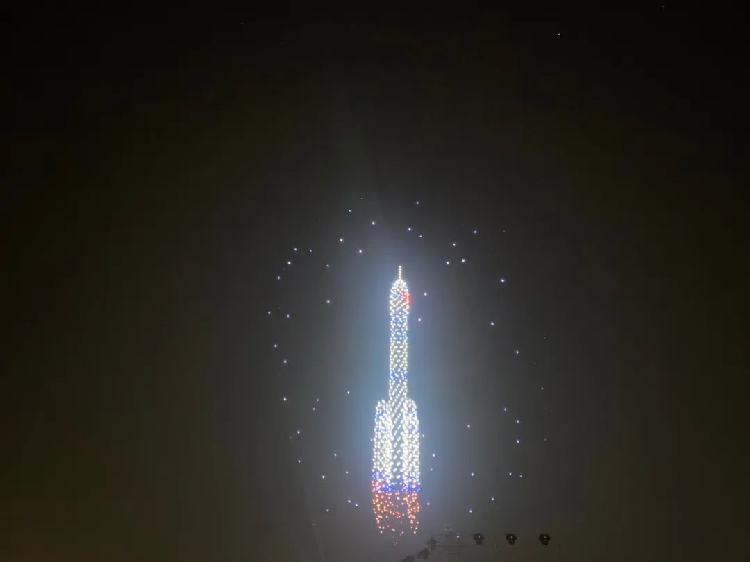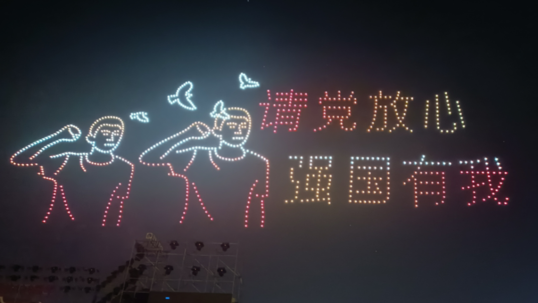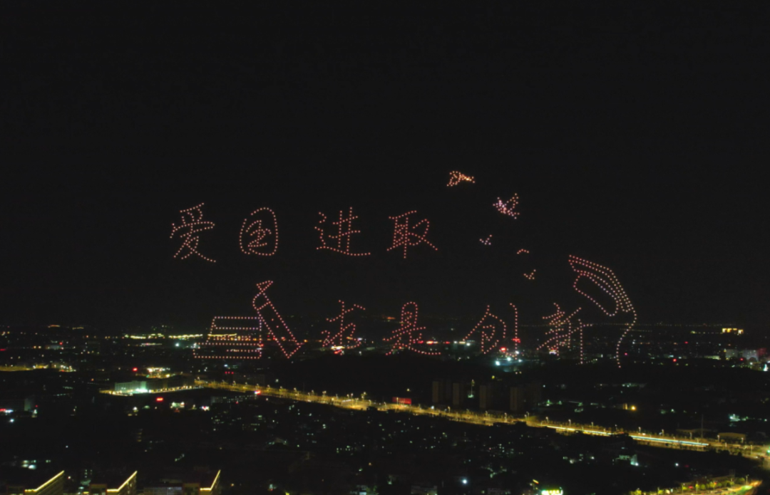 夜幕降临,伴随着优美的音乐,1200架无人机在广场上空起飞,不时变换出“神舟十五飞船发射瞬间” “歼20双机编队” “国旗”等多个与国防教育主题相关的字样;负责团队还将“请党放心、强国有我”、“爱国进取、求是创新”等振奋人心字样融入校庆表演中。