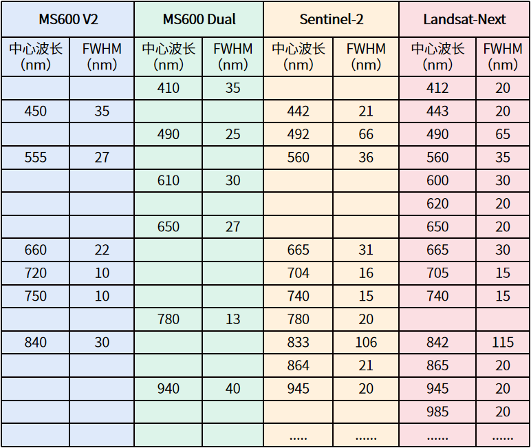 (MS600 V2、MS600 Dual与Sentinel-2、Landsat-Next波段对比表)