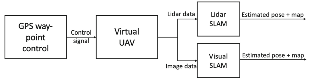 最后一个重要部分是用于结构检查的无人机控制系统。由于模块化和简单的架构设计,很容易更换任何其他控制系统。在这项工作中,我们使用开环控制系统(图2)。GPS航点控制器连续向无人机发送控制信号,无人机发出传感器数据,SLAM算法处理数据。我们采用DSO和HDL Graph SLAM。它们都是视觉 SLAM 和激光雷达SLAM的表示形式。