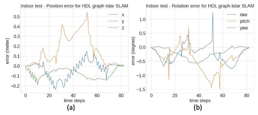 室内和室外情况的位置误差和角度误差如图5、6、7和8所示。在这两种情况下,当无人机返回靠近原点的区域并形成闭环时,HDL Graph SLAM的位置误差将首先增加和减少。HDL Graph SLAM的位置误差的RMSE在室内情况下为0.143 m,在室外情况下为1.05 m。HDL图形SLAM的角度误差的RMSE为0.5∘C在室内外壳和5.68∘C在室外的情况下。与HDL Graph SLAM相比,当无人机返回原点时,估计姿态的误差不会减小。