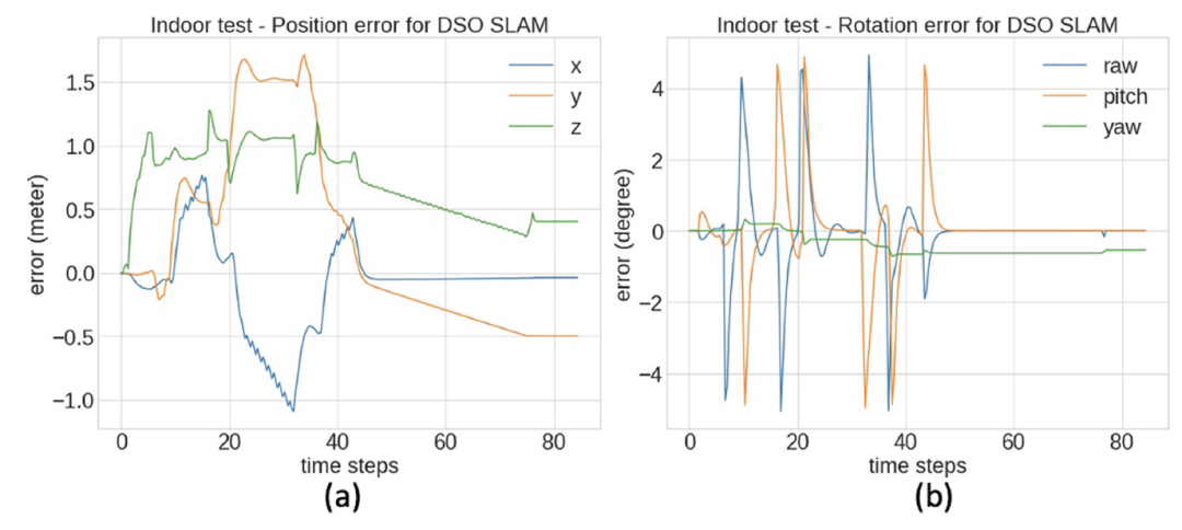 图8 室内情况下的位置误差(a)和角度误差(b)DSO SLAM