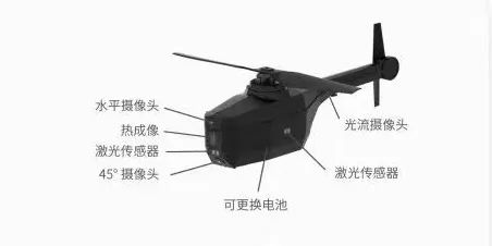 如图所示,最上方水平摄像头用于探测水平方向的目标;热成像摄像头通过红外线转换为实时图像,可用于夜间侦察或探测伪装目标;45°摄像头用于侦察下面方向的目标(无人机飞高后可实时切换水平和下视摄像头);而后侧的光流摄像头可进行水平定位。