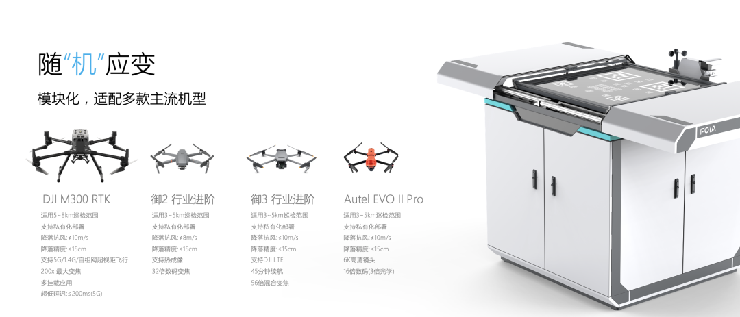 一般来说,根据无人机类型对应可适配的无人机机场类型即可。目前复亚智能A30EC无人机自动机场已打通大多数主流机场的类型,用户可根据场景需求灵活选用无人机。