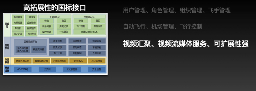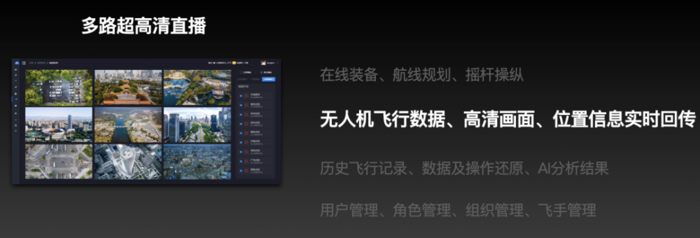 “天翼星云”无人机飞控管理平台,实现管人、管机、管舱、管任务、管数据,搭载国标接口,满足多种形式的视频流媒体服务,支持多种数据交互方式,实现松耦合,快速响应优化调整;适配市面80%无人机主流机型。