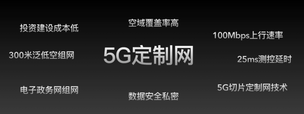 300米泛低空5G无人机定制网:低投入:充分复用5G基站,降低国有资产投资建设成本;私密强:5G无人机定制专网,物理级隔离,数据私密强;广覆盖:利用5G网络的多波束赋形能力,调整波束的俯仰角,解决空域信号弱、信号杂乱问题。