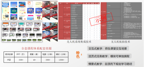 根据当前市场无人机的主要应用领域提供多方向的行业应用案例课程,包括农业植保实训项目、无人机航拍实训项目、无人机测绘实训项目及系留无人机实训项目。以上行业应用实训项目均配套相应的课程资源(项目任务式模块化教学),满足职业院校实训教学。