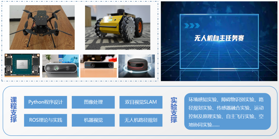 无人机作为一个复杂工程,是一个多学科交融的载体平台,通过搭载机载计算单元、激光雷达、双目相机等传感器,通过程序编程可实现智能飞行。同时通过分布式协同控制,也可进行智能协同飞行,也是当前的热点研究领域。智能无人机类产品可支持职业院校的学生更进一步的提升学习深度,所有软硬件接口全部开发,可支持学生进行二次开发,提升就业竞争力。同时对于即将专升本的职业院校,在学生综合能力培养上提供教学支撑。