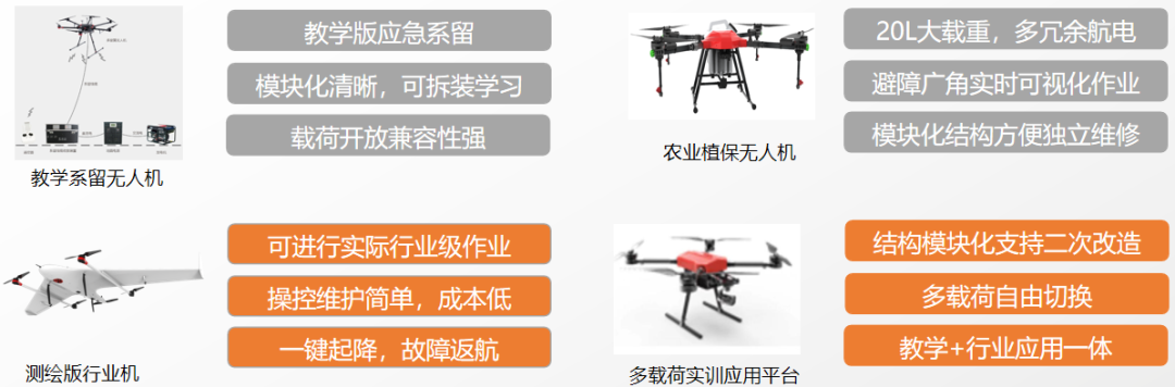 基础类设备是专为教学开发设计的产品,具备易拆卸、易维护、抗摔打、价格低廉等优点,主要用于支撑对无人机专业技能的基础培养,包括无人机操控飞行、无人机安装与调试、无人机检测与维修等技术的培养。让学生掌握多旋翼无人机、固定翼无人机的操控与装调技术。同时匹配无人机飞行执照考试用机,用于支撑学生考试练习。